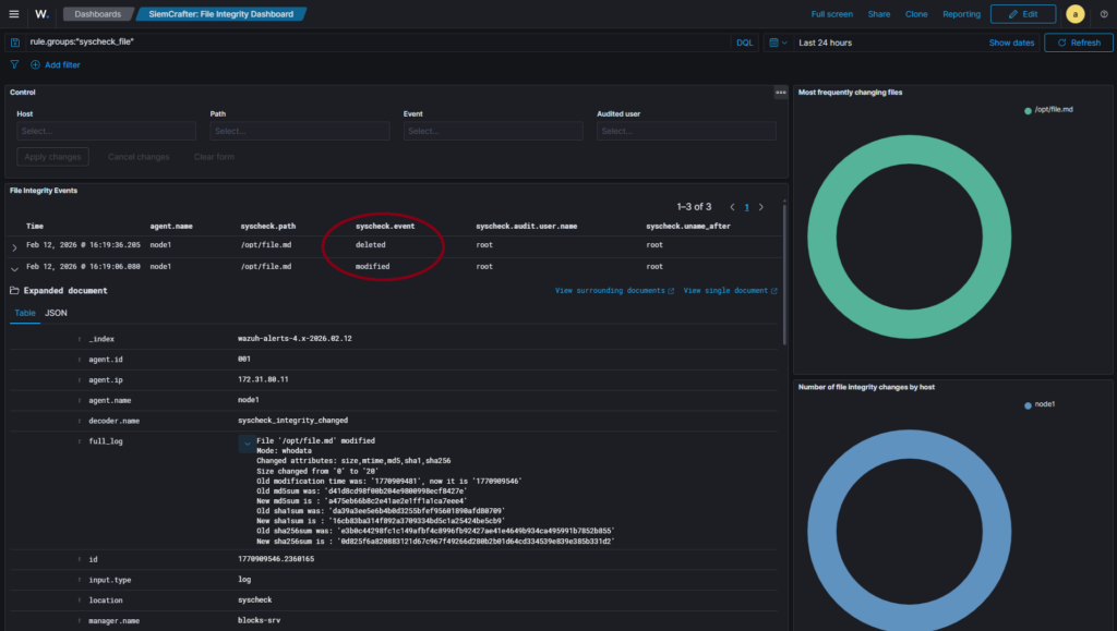 This Ansible role (designed by me) enables rapid configuration of File Integrity Monitoring (FIM) in Wazuh and automatically deploys a prebuilt minimalist dashboard for investigating file integrity events. With this solution, you can define the file paths or directory structures you want to monitor. After a quick deployment process, you will immediately gain visibility into all modifications affecting the configured files and folders.